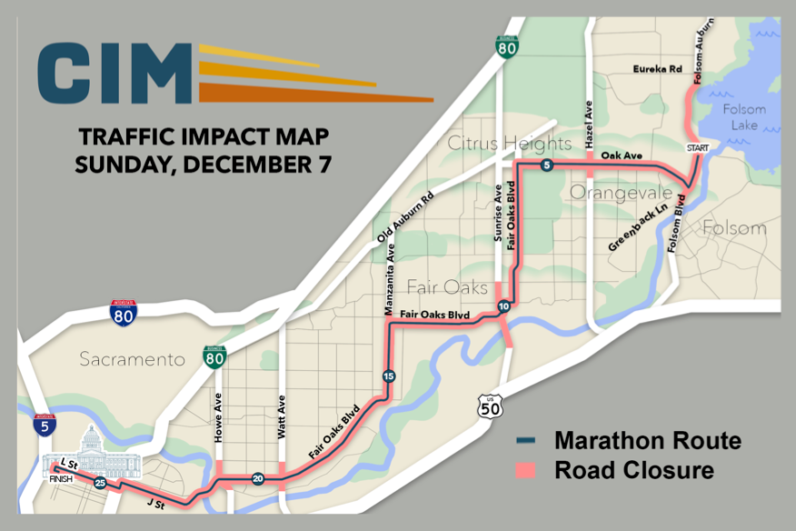 This map shows the route for the California International Marathon happening on December 7th, 2025. Fair Oaks Blvd will be blocked off until 11 am, so our service time has shifted to after the road re-opens.
