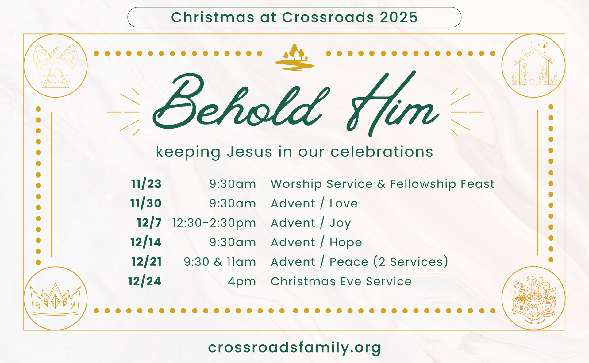 Scroll through our Advent Season Schedule to see our Service Times for this year.