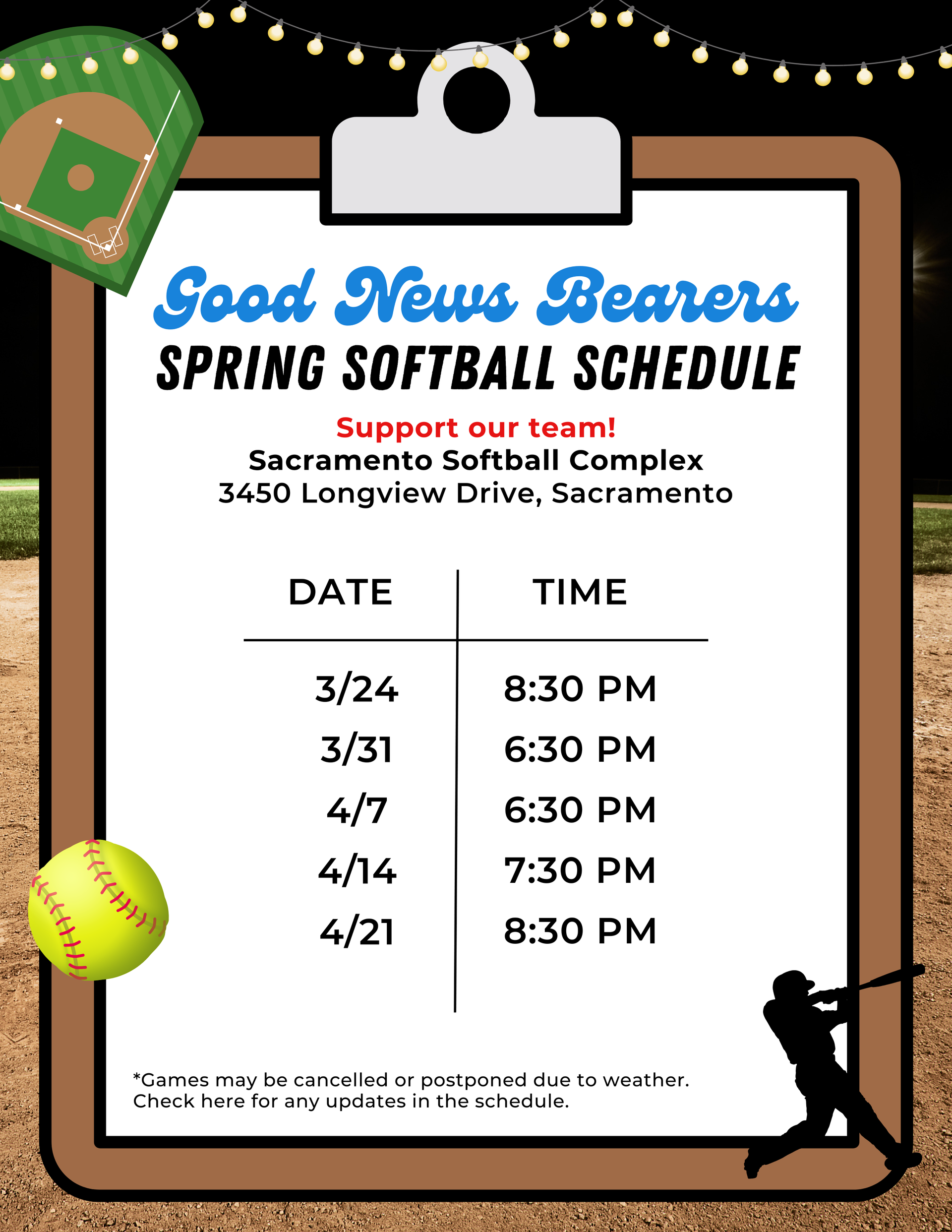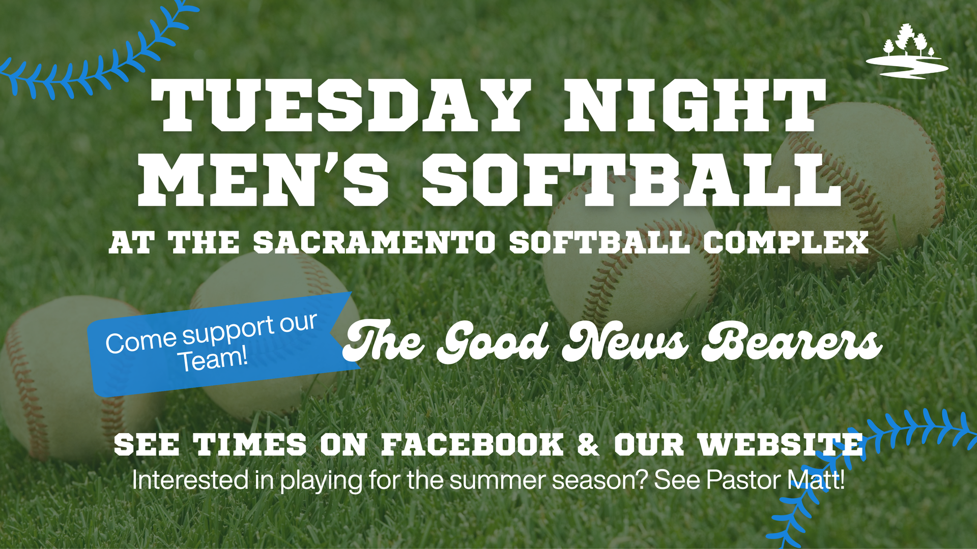Come support our team, The Good News Bearers, on Tuesday nights at the Sacramento Softball Complex (3450 Longview Drive, Sacramento)